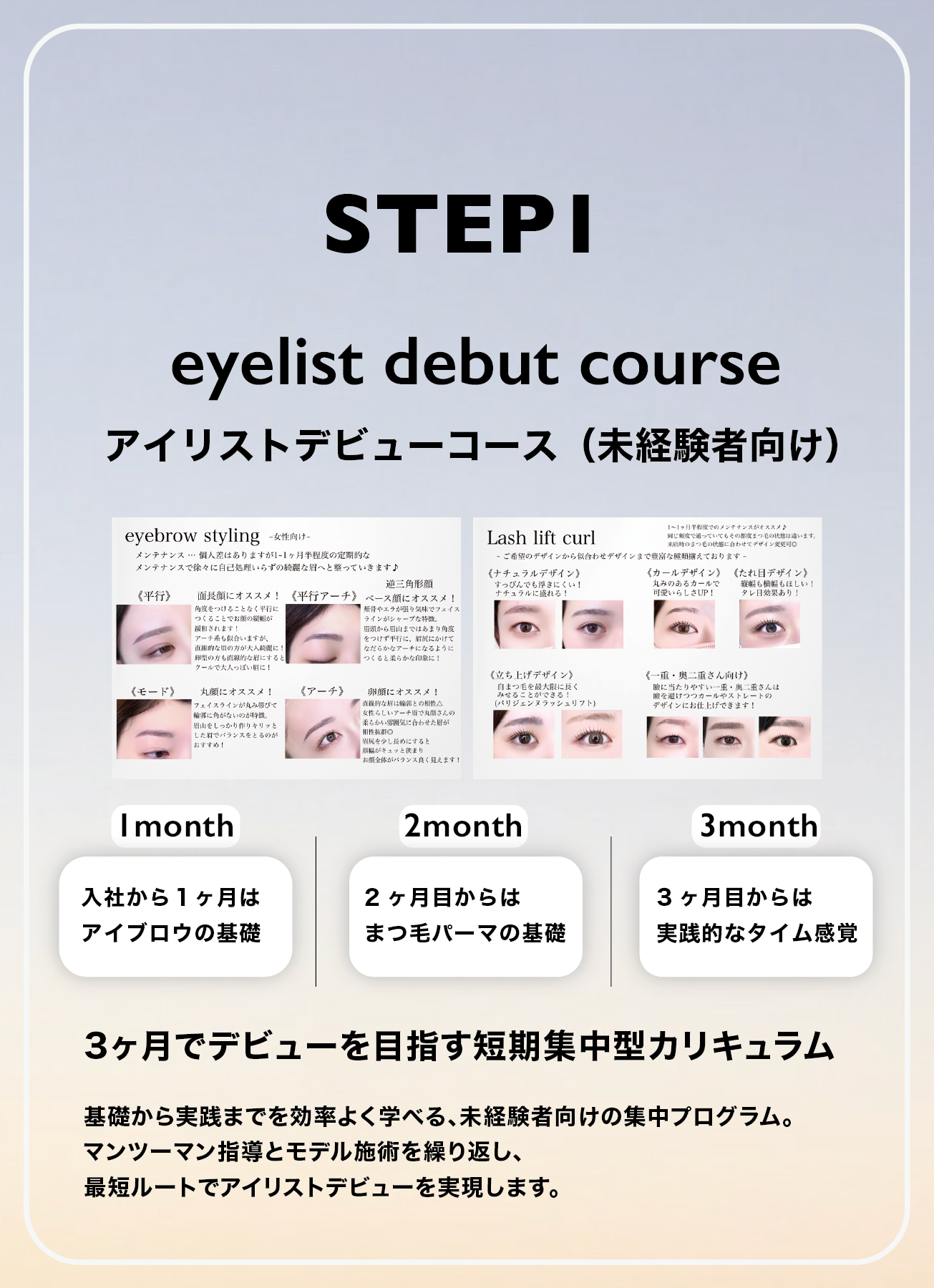まつ毛パーマ・WAXなどの基本技術に加え、モデル施術やカウンセリング研修、マナー指導まで幅広く学べます。マンツーマン指導と段階的なステップで、最短3ヶ月でのデビューを目指します。